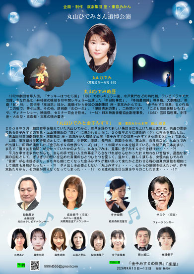 以降、東京都杉並区を拠点として、新宿区、中野区、港区、長門市、四国中央市、富山市、奈良市など、丸山ひでみが金子みすゞを演じ、田辺が演出した「金子みすゞの世界シリーズ」は、17年間で50本を越えている・・・。まるで“限りある時間”が分かっていたかのように、丸山ひでみは、見事な金子みすゞを演じ続けた・・・・?!